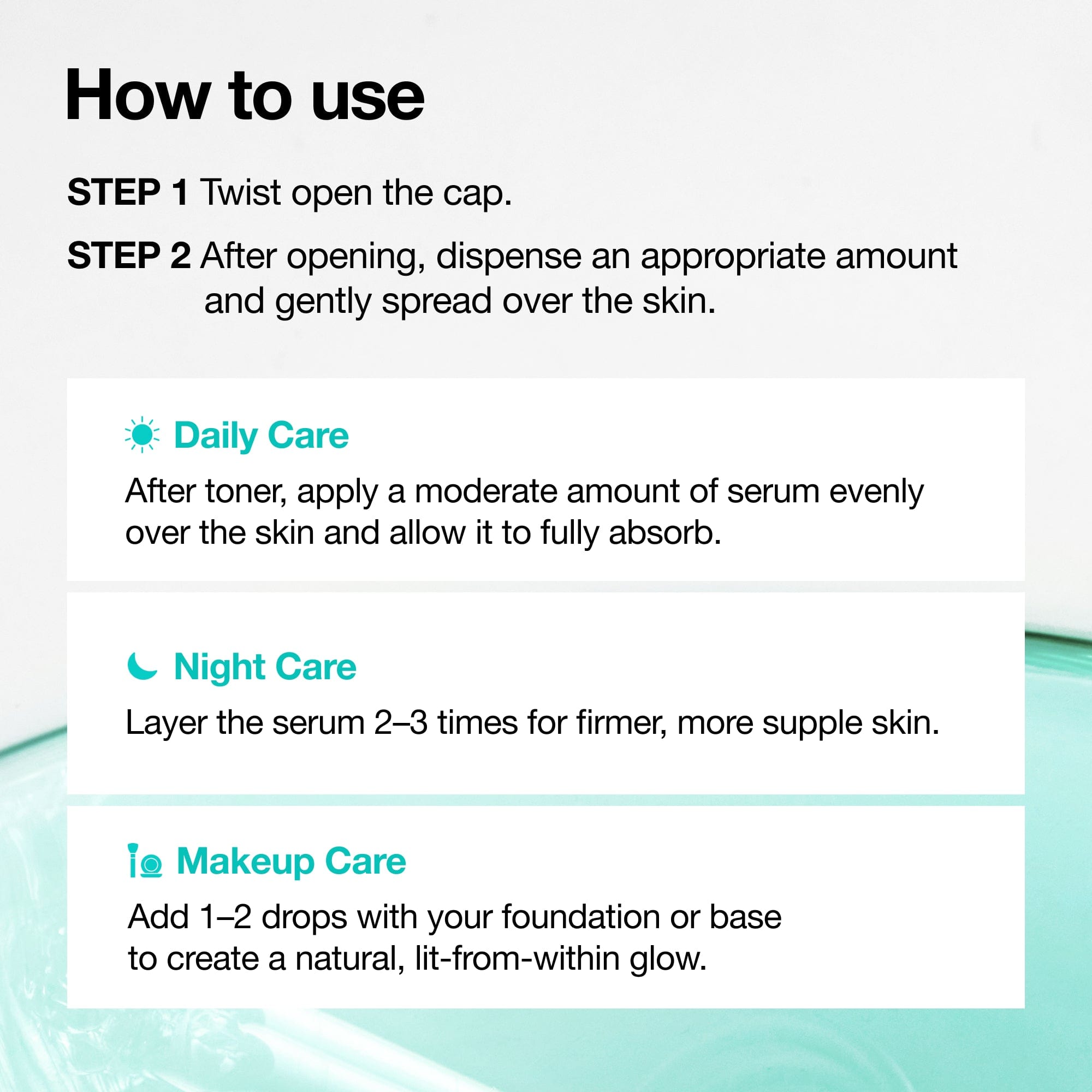 Next, apply a small amount of the serum evenly across the face, avoiding the eye area. Start with a few times a week and gradually increase frequency as your skin builds tolerance.